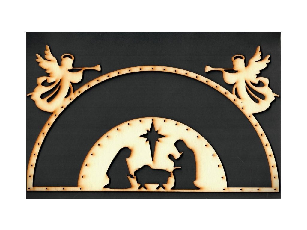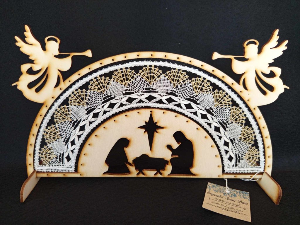 Překližkový výřez určený pro dekorování paličkovanou krajkou. Vhodný pro zavěšení do okna nebo se nechá postavit (součástí jsou i malé "nožičky"). Celková velikost betlému: 17 x 29,5 cm. Pro uchycení krajky, doporučujeme použít jemný vlasec nebo silonové vlákno - Nylon. Barva: přírodní (viz foto).