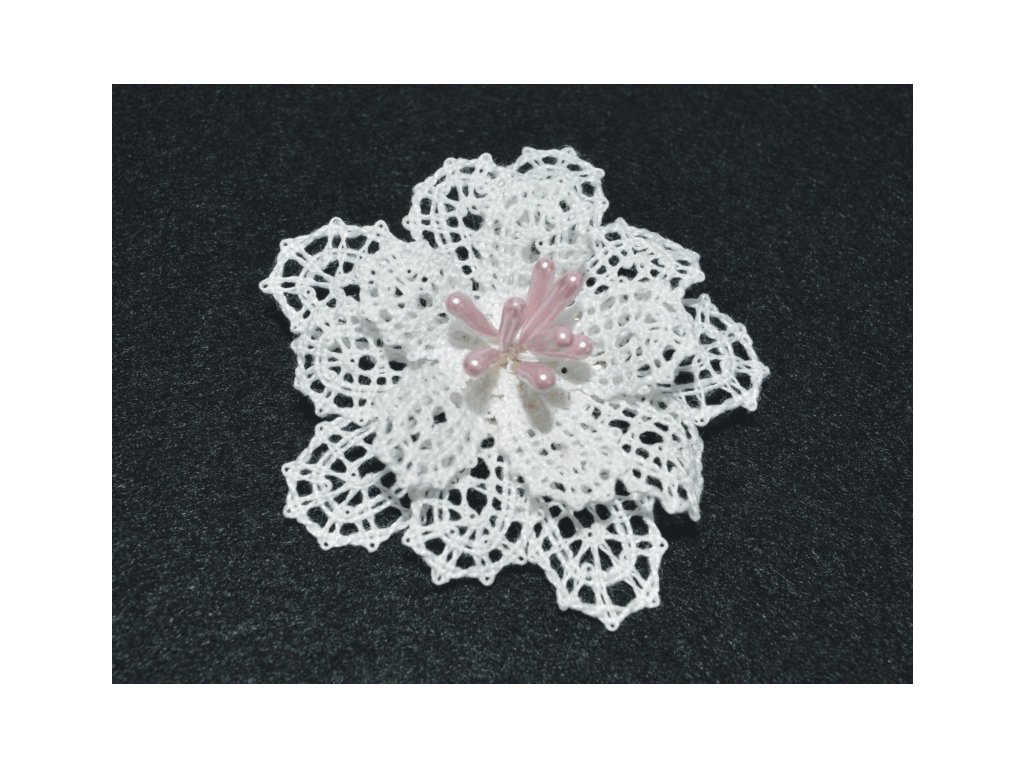 Malá, drobná brož ve tvaru květu. Velikost brože: 6 cm, krajka: bílá s růžovými pestíky. Zapínání: brožový můstek (spínací špendlík). V ceně dárková krabička.