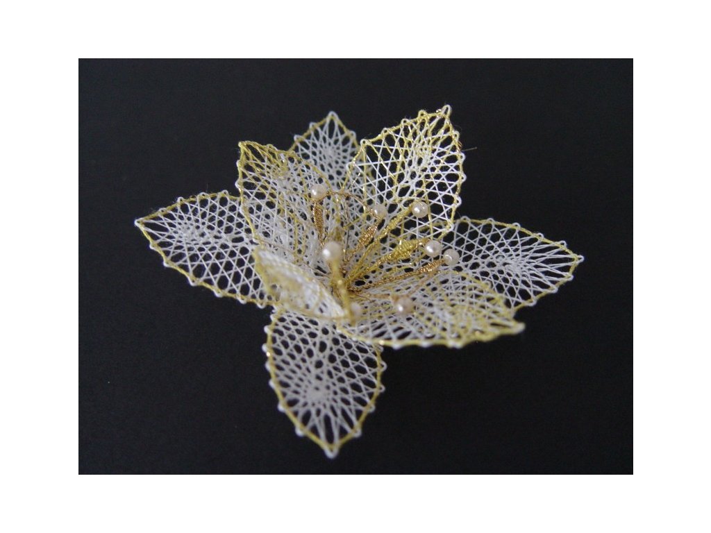 Brož ve tvaru květu. Velikost brože: 7,5 x 8 cm, krajka: bílá se žluto-zlatou s perličkami. Zapínání: brožový můstek (spínací špendlík). V ceně dárková krabička.