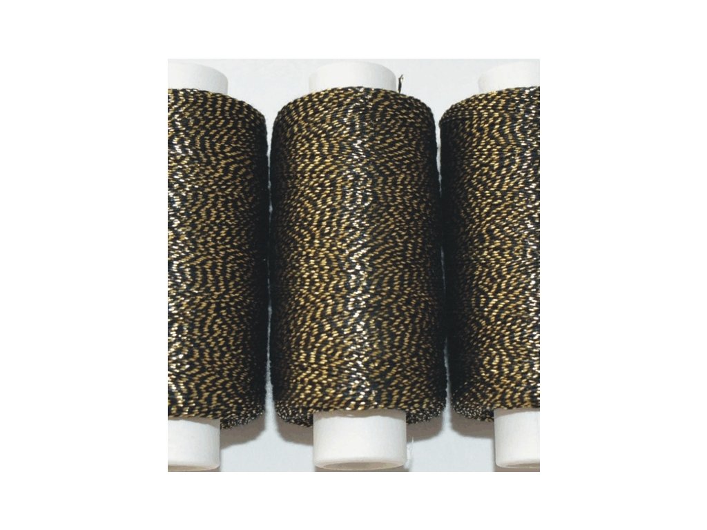 Nitě BAVLNĚNÉ-METALICKÉ, odstín: černá bavlněná niť se zlatým proužkem, jemnost: 24, návin: 200m, složení: 90% bavlna, 10% pokovené vlákno, ČESKÝ VÝROBEK.