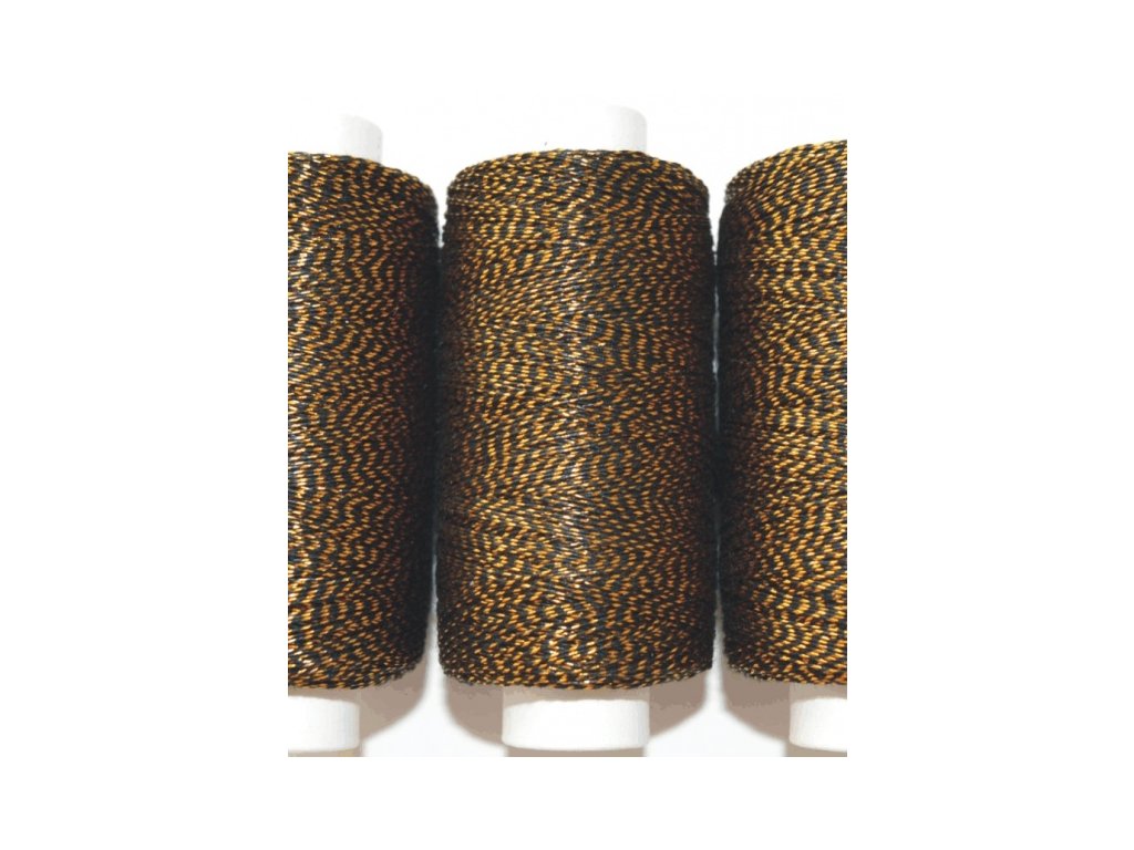 Nitě BAVLNĚNÉ-METALICKÉ, odstín: černá bavlněná niť se zlatým proužkem, jemnost: 24, návin: 200m, složení: 90% bavlna, 10% pokovené vlákno, ČESKÝ VÝROBEK.