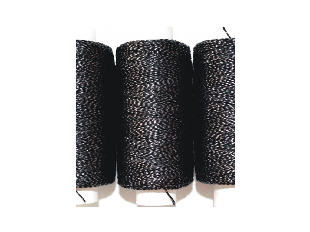 Nitě BAVLNĚNÉ-METALICKÉ, odstín: černá bavlněná niť s hnědým metalickým proužkem, jemnost: 24, návin: 200m, složení: 90% bavlna, 10% pokovené vlákno, ČESKÝ VÝROBEK.