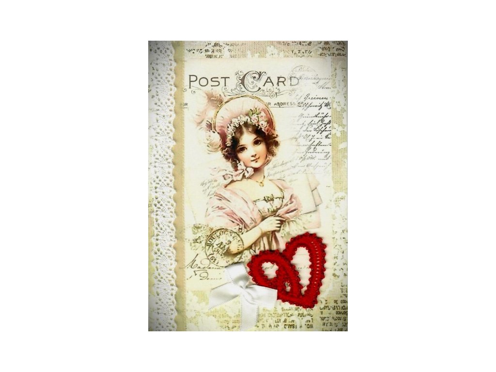 Dárková karta (přání) velikost: 11 x 16 cm, paličkovaná krajka: malé červené  srdce, dodáváme s obálkou v ochranné folii. Krajku je možné bez poškození sejmout.