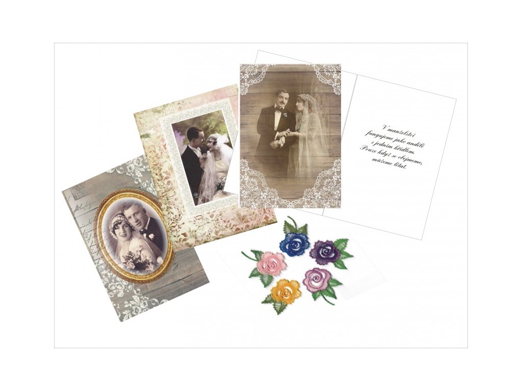 Dárková karta pro různé typy příležitostí - přání novomanželům. Navrhneme a vyrobíme originální dárkovou kartu přímo pro Vás. Velikost a barevnost dle Vašich požadavků. Krajka doplňující originální karty je variabilní - koresponduje s námětem a barevností karty. Krajka je snímatelná, možné další praktické využití. Dodáváme s odpovídající obálkou.