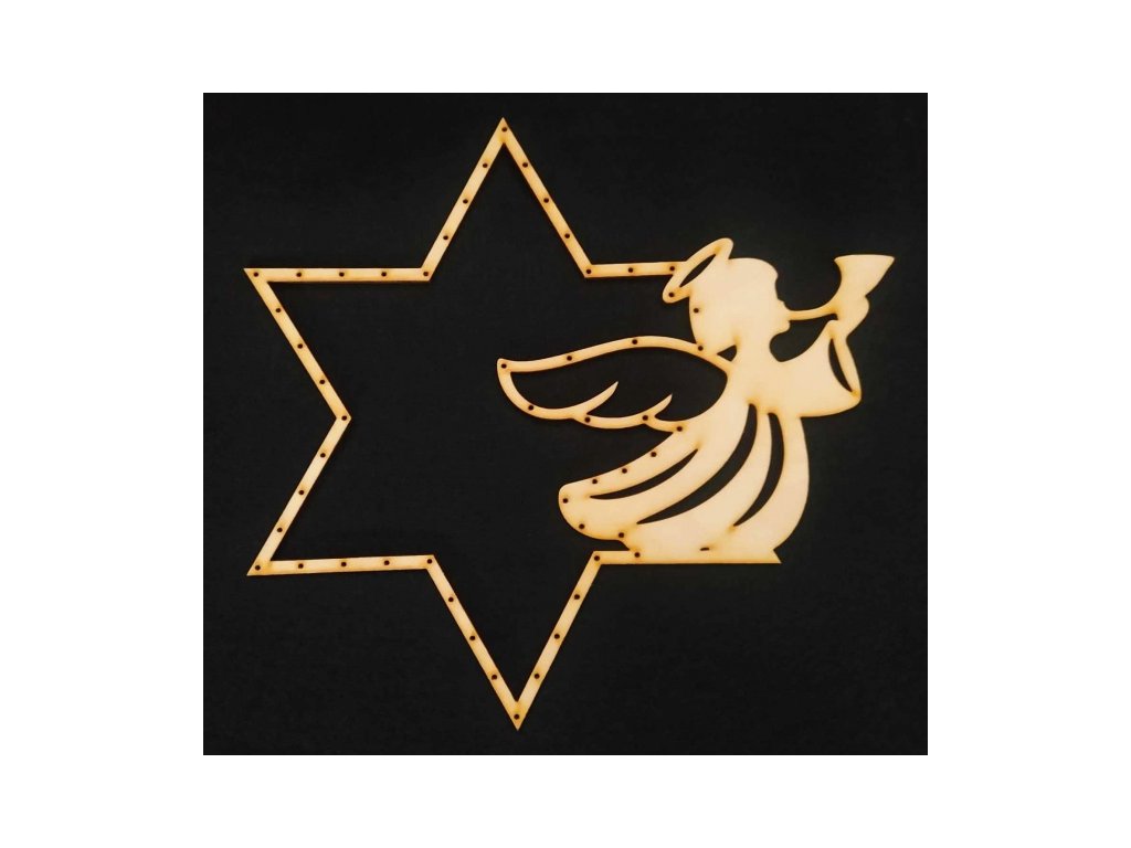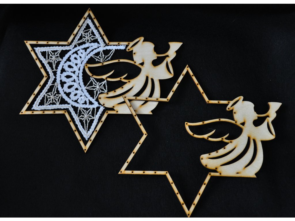 Překližkový výřez určený pro dekorování paličkovanou krajkou. Vhodný pro zavěšení na dveře nebo do okna. Celková velikost hvězdy: 20 x 22 cm. Pro uchycení krajky, doporučujeme použít jemný vlasec nebo silonové vlákno - Nylon. Barva: přírodní (viz foto).