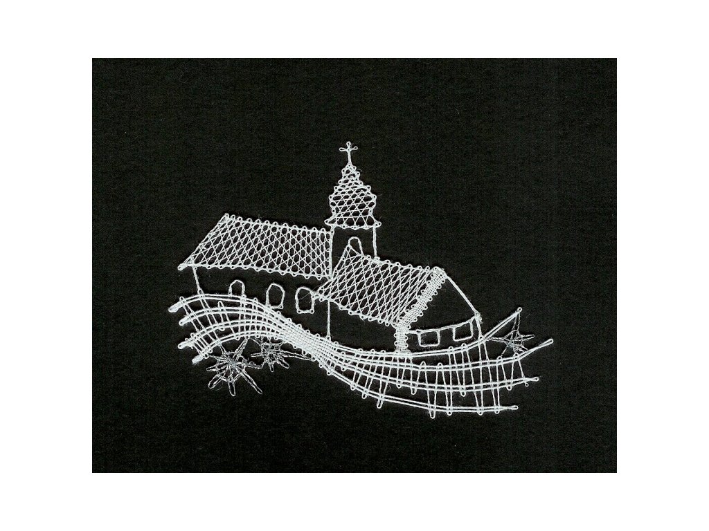 Velikost s rámem: 14,5 x 19,5 cm, velikost krajka: 7 x 10 cm, krajka: bílo/stříbrná (viz.foto), podklad: černý. Cena včetně rámečku (dle aktuální nabídky).