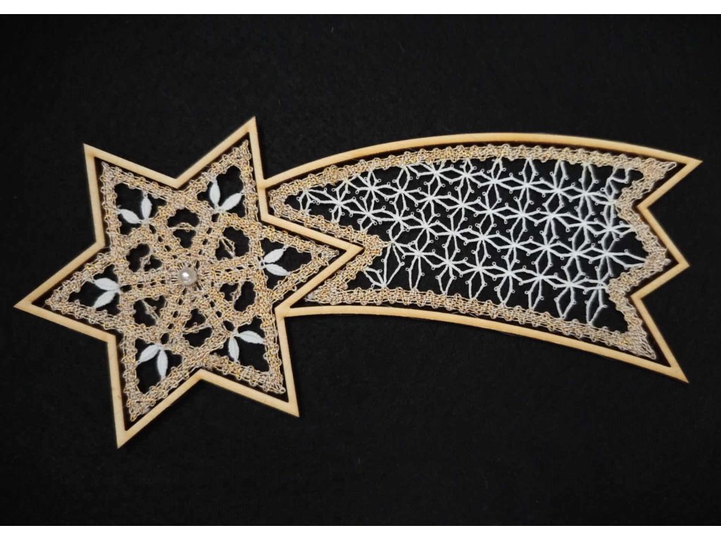 ZÁVĚS - velikost překližkového výřezu: 10,5 x 23,5 cm, krajka doplňující kometu: bílo/zlatá (viz.foto) - doplněná bílou perličkou, Krajka je k výřezu přišitá monofilovým vláknem. Vánoční dekorace vhodná na zavěšení do prostoru.