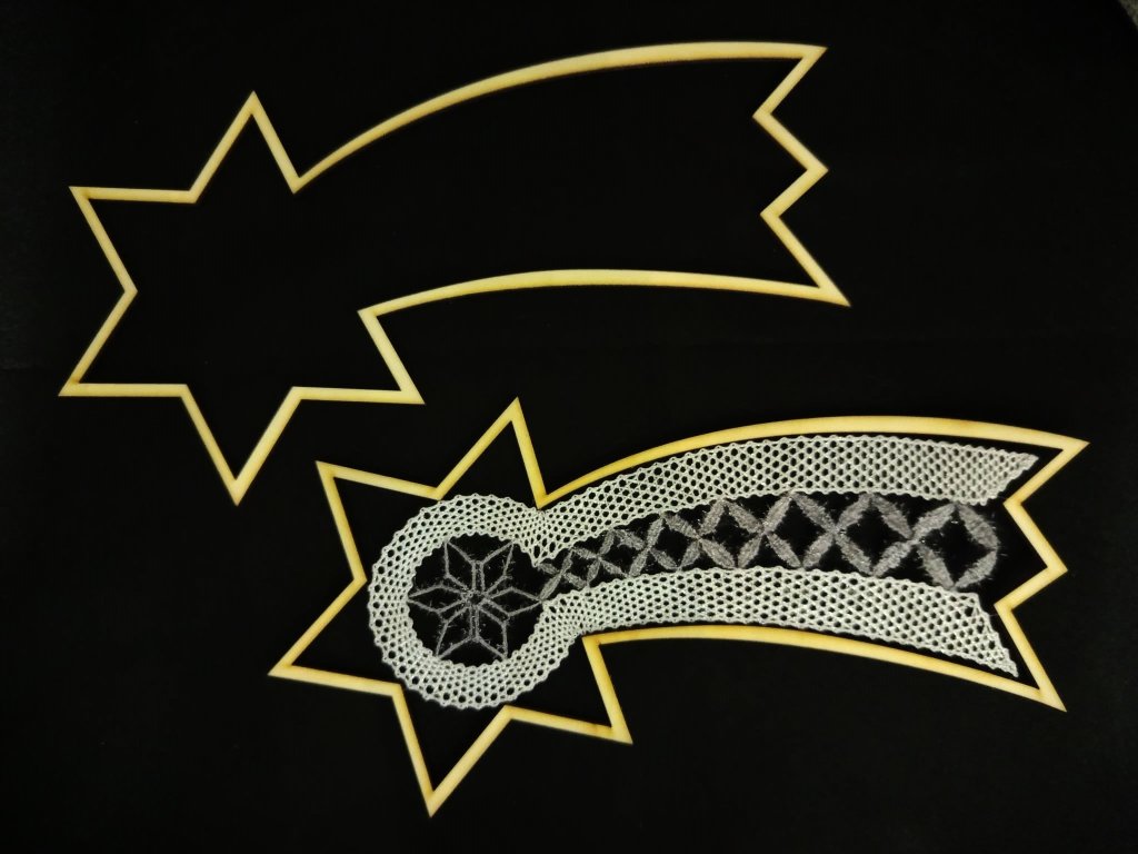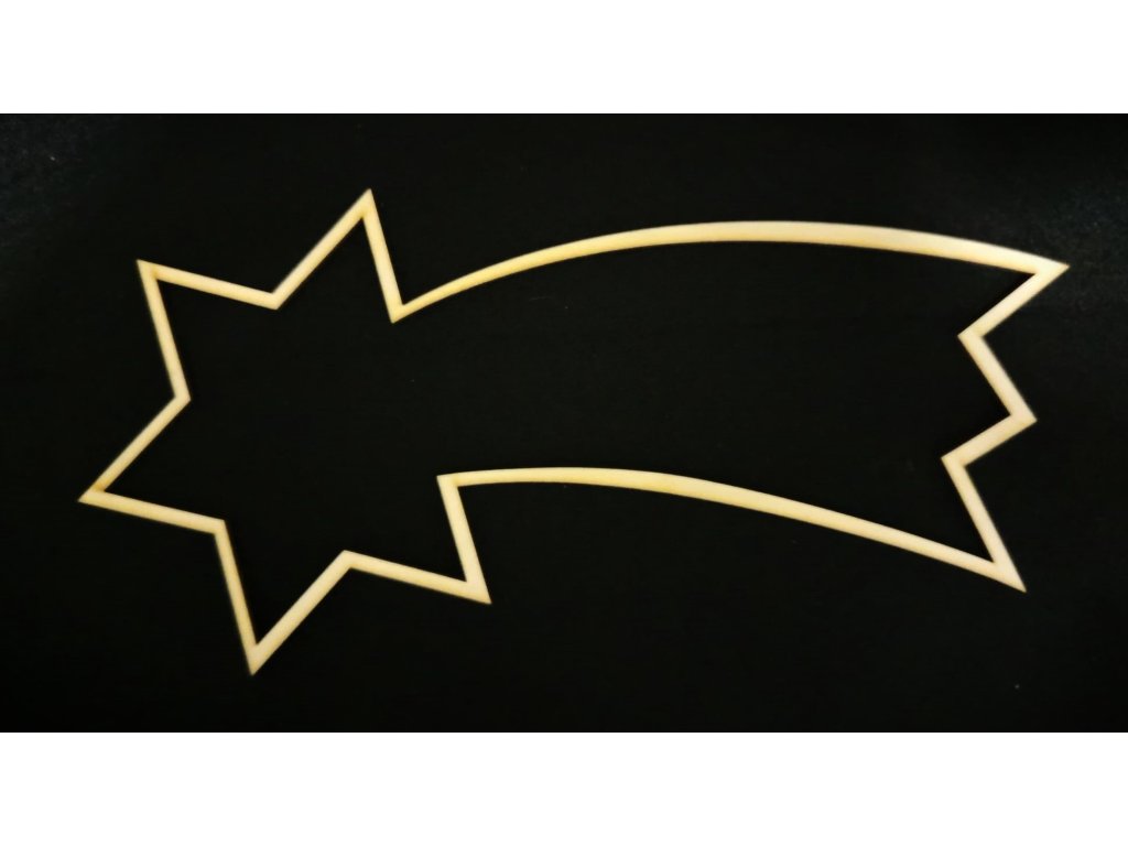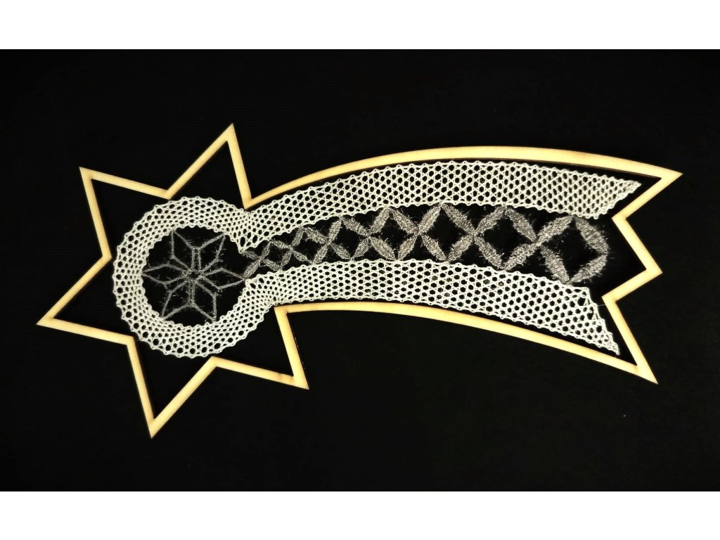 Překližkový výřez určený pro dekorování paličkovanou krajkou. Vhodný pro zavěšení na dveře, do okna nebo do prostoru. Celková velikost Komety: 16 x 31 cm. Pro uchycení krajky, doporučujeme použít jemný vlasec nebo silonové vlákno - Nylon. Barva: přírodní (viz foto).