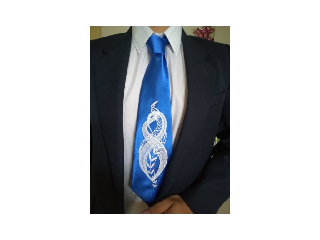 Základ tvoří lesklá nebesky modrá látková kravata - šíře 10 cm, délka 150 cm. Krajková aplikace je v bílém provedení, pevně přišitá k látkovému podkladu. Dodáváme v dárkové krabičce. Na Vaše přání můžeme změnit barvu kravaty nebo krajkové aplikace. Případné barevné provedení napište do objednávkového furmuláře - do poznámky.