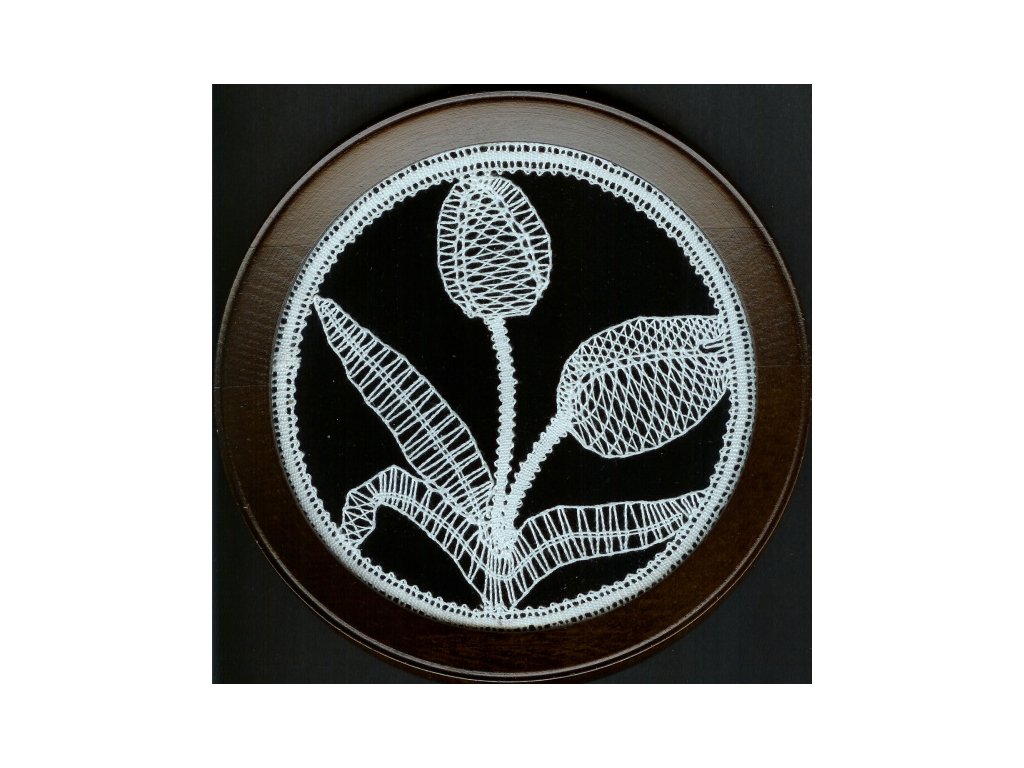 Velikost i s rámem: 19 cm, krajka: bílá, podklad: černý + tm. hnědý rám kulatý.