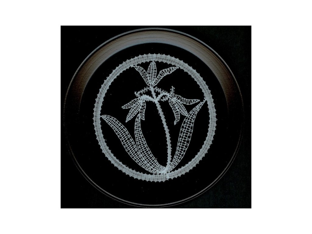 Velikost rámečku: 18,5 x 18,5cm, velikost krajky: 12,5 x 12,5cm, krajka: bílá, podklad: černý + rám tm.hnědý kulatý.