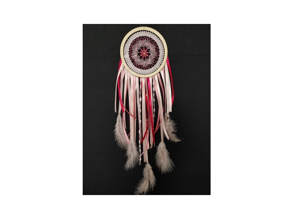 Mini lapač snů, velikost kruhu: 12 cm, celková velikost: 12 x 50 cm, základ tvoří dřevěný výřez (kruh) + stuhy, peříčka, barva: viz foto