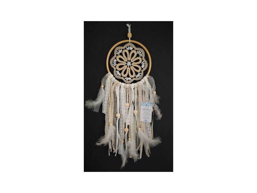 Velikost kruhu: 20 cm, celková velikost: 20 x 60 cm, základ tvoří bambusový kruh a paličkovaná krajka (100% bavlna) + stuhy, peříčka a dřevěné korálky, barva: viz foto