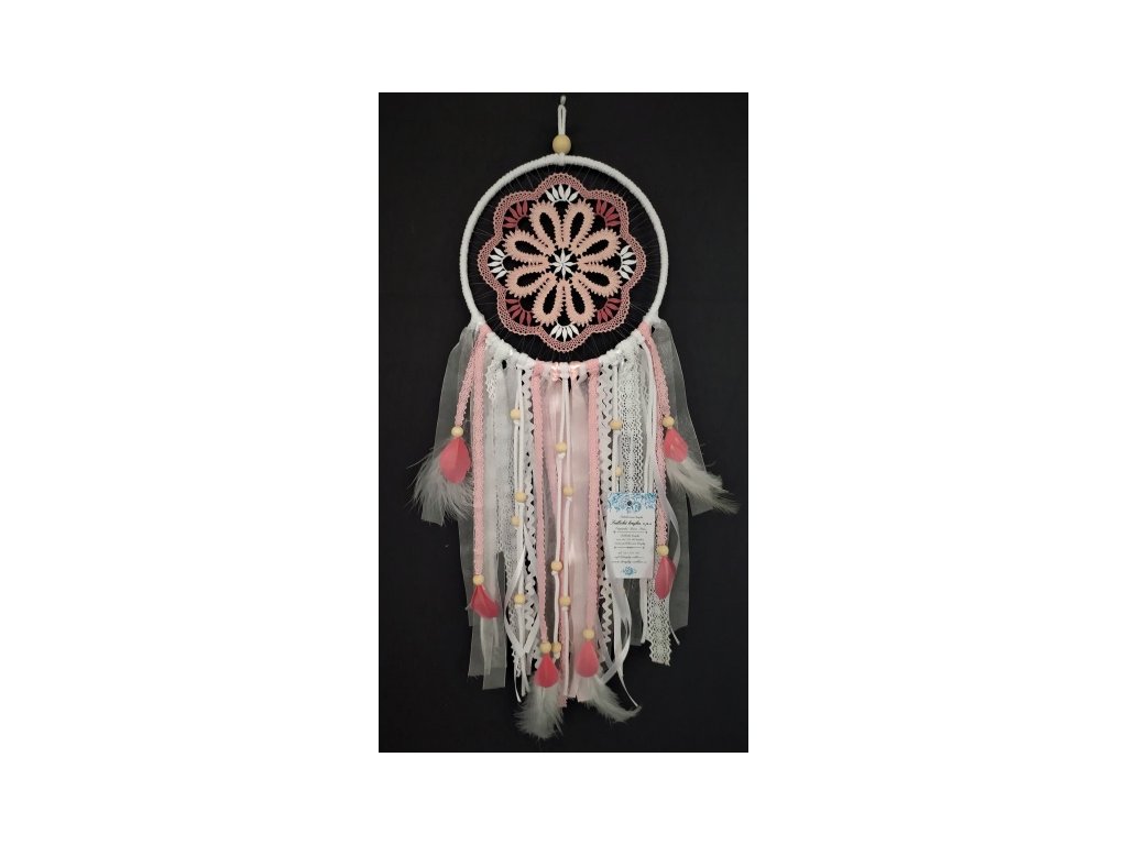 Velikost kruhu: 20 cm, celková velikost: 20 x 60 cm, základ tvoří kovová obruč - omotaná bavlněnou přízí - Macrame (kruh) a paličkovaná krajka (100%bavlna) + stuhy, peříčka a dřevěné korálky, barva: viz foto