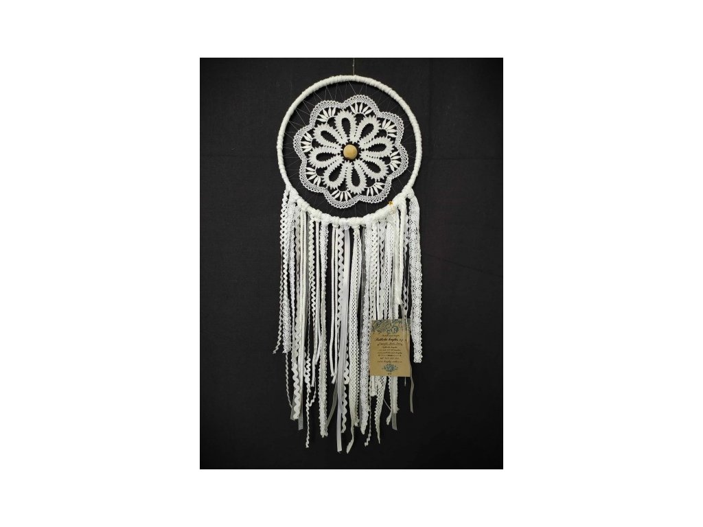 Velikost kruhu: 20 cm, celková velikost: 20 x 55 cm, základ tvoří kovová obruč - omotaná bavlněnou přízí Macrame (kruh) a paličkovaná krajka (100%bavlna) + různé stuhy, uprotřed - velký dřevěný korálek, barva: viz foto