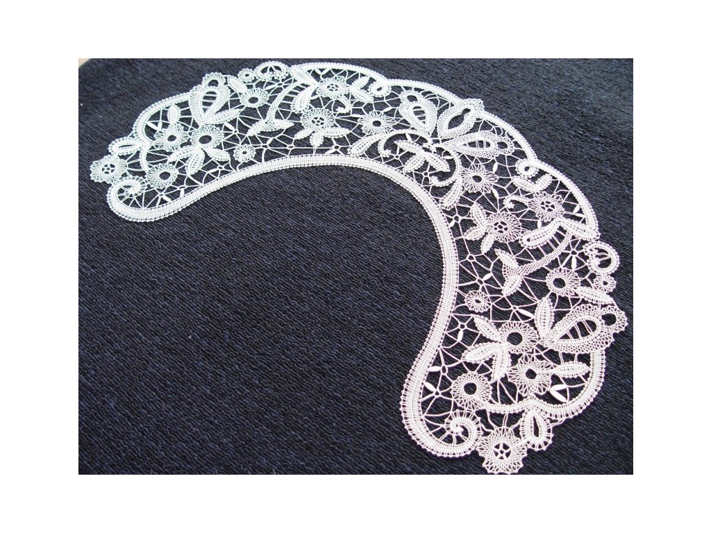 Vnitřní obvod krajky (kolem krku): 43 cm, šíře krajky: 14 cm, barva krajky: bílá