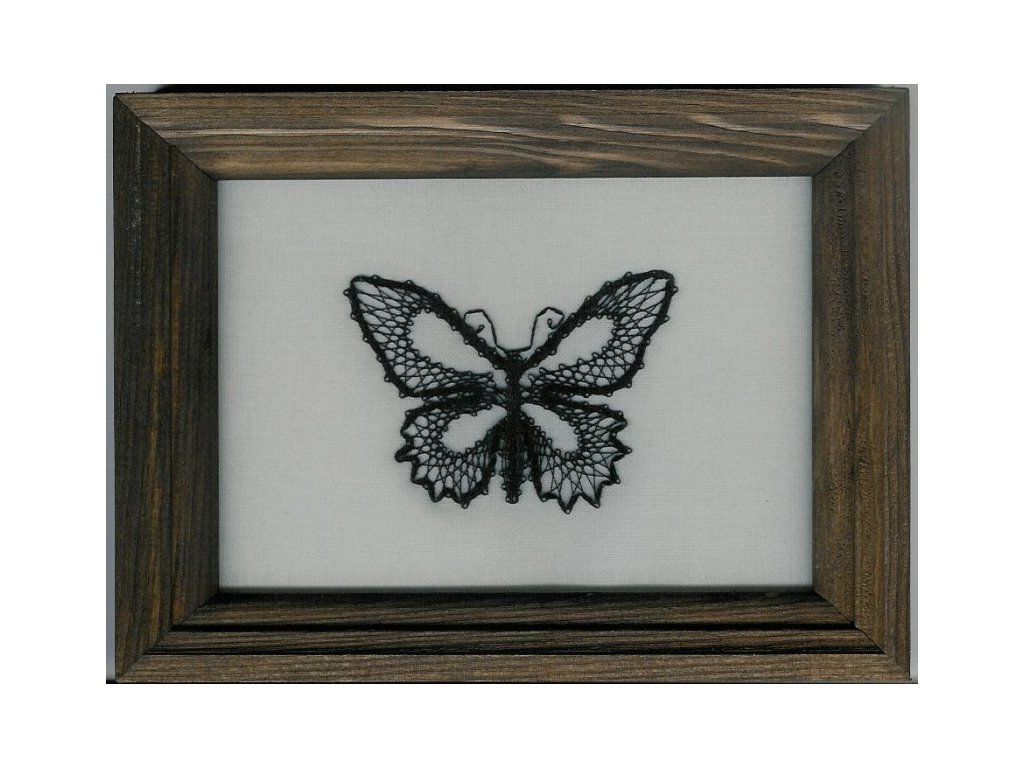Velikost i s rámem: 15 x 20 cm, velikost krajky: 7 x 4 cm, krajka: černá (viz.foto), podklad: bílý / krémový. Cena včetně rámečku (dle aktuální nabídky). Do poznámky můžete uvést barvu motýla - vyrobíme na přání, dle Vašeho požadavku.
