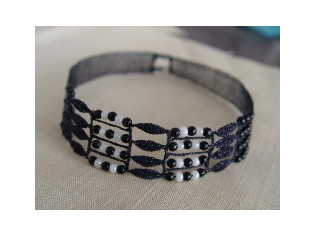 Kombinace krajky s černými a bílými perličková, barva krajky: černá s metalickým leskem, zapínání na 2 háčky, maximální délka: 38 cm.