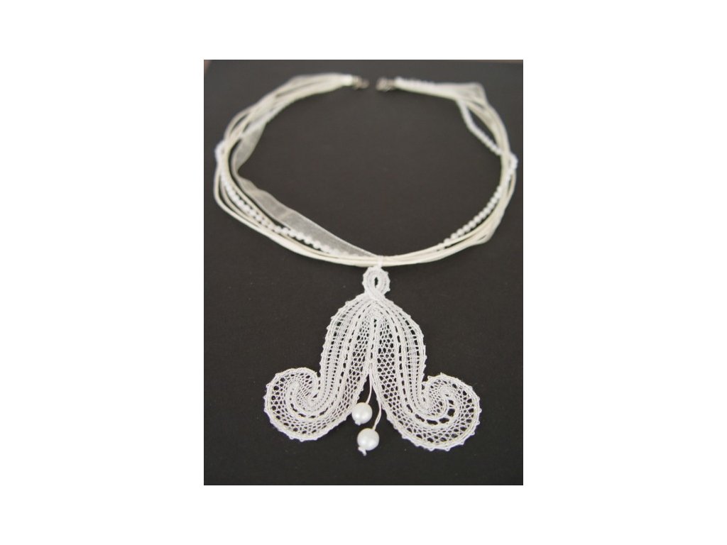Velikost krajky: 6,5x7cm, barva: bílá+bílé perličky, šňůrka látková krémová s bílými perličkami, max. délka: 43cm.