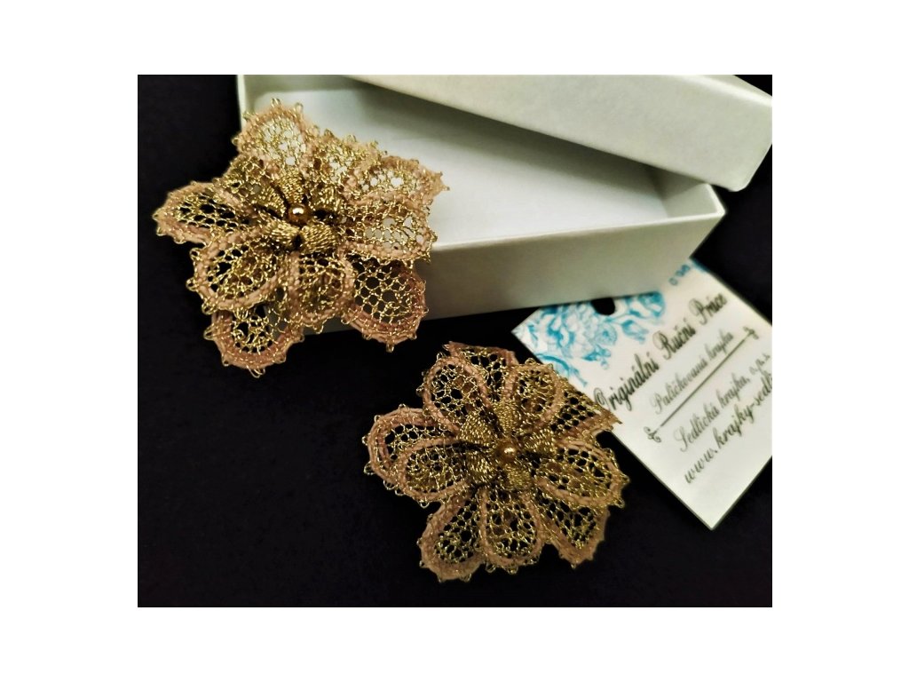 Luxusní naušnice vyrobené ze "zlaté" metalické kovové nitě. Tvar květinky. Velikost jedné náušnice 5x5 cm. Dozdobeno "zlatým" metalickým korálkem. Zapínání : zlaté puzetové. Dodáváme v dárkové krabičce.