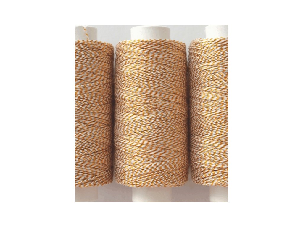 Nitě BAVLNĚNÉ-METALICKÉ, odstín: bílá bavlněná niť se zlatým metalickým proužkem, jemnost: 10, návin: 140m, složení: 90% bavlna, 10% pokovené vlákno, ČESKÝ VÝROBEK.