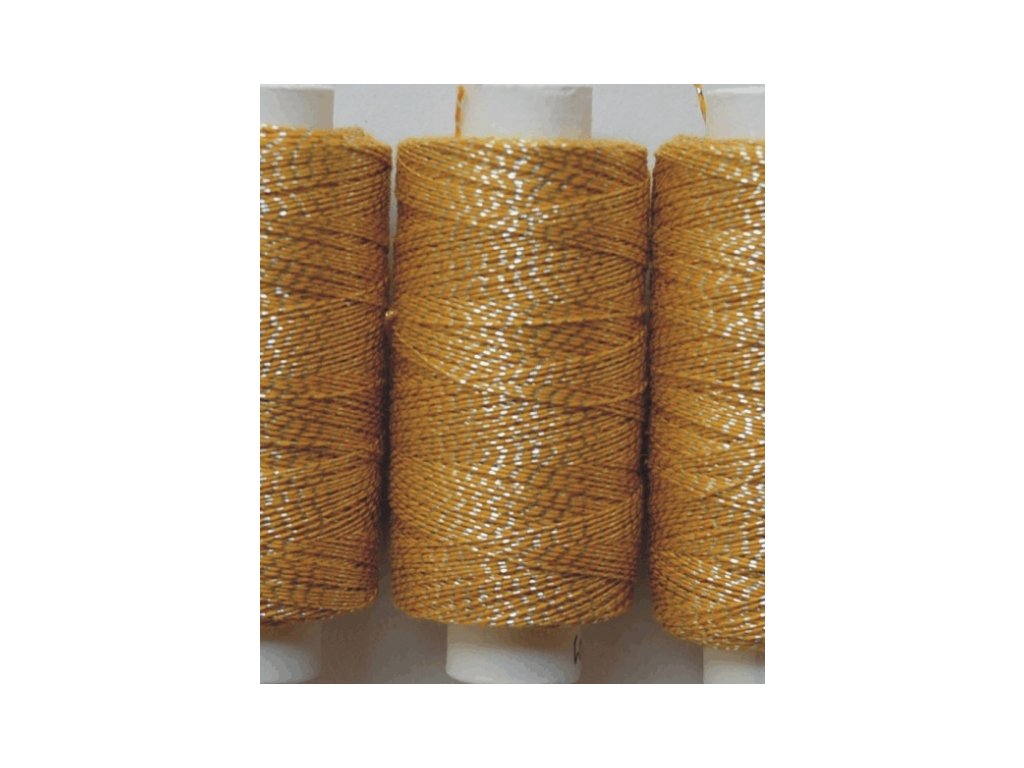 Nitě BAVLNĚNÉ-METALICKÉ, odstín: žlutá bavlněná niť se stříbrným metalickým proužkem, jemnost: 10, návin: 140m, složení: 90% bavlna, 10% pokovené vlákno, ČESKÝ VÝROBEK.