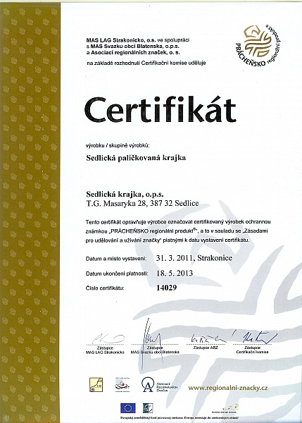MAS LAG Strakonicko, o.s. ve spolupráci s MAS Svazku obcí Blatenska, o.p.s. a Asociací regionálních značek, o.s. na základě rozhodnutí Certifikační komise uděluje