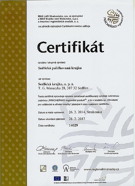 CERTIFIKÁT výrobku/skupině výrobků: "Sedlická paličkovaná krajka".