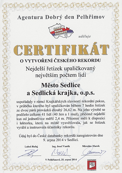 Sedlická krajka, o.p.s. získala: CERTIFIKÁT o vytvoření českého rekordu "Nejdelší řetízek upaličkovaný největším počtem lidí"