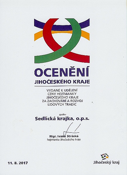 Sedlická krajka, o.p.s. získala: Cenu hejtmanky Jihočeského kraje za zachování a rozvoj lidových tradic