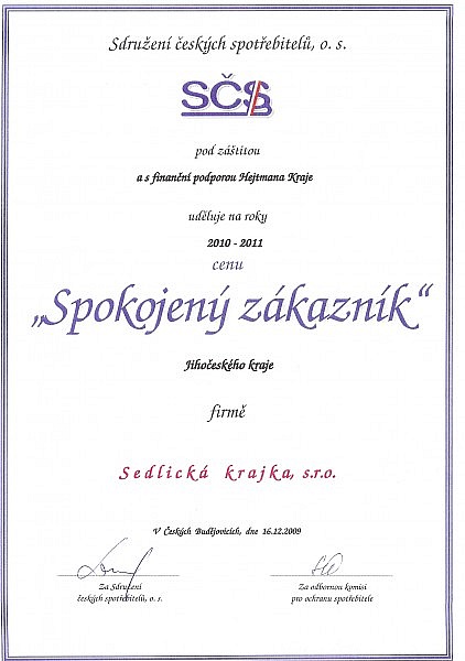 Jihočeského kraje udělilo za rok 2010 - 2011 cenu "SPOKOJENÝ ZÁKAZNÍK".