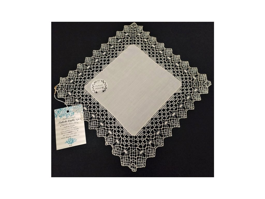 Krajkový okolek je vsazený do plátna (100% bavlna). Celková velikost: 27 x 27 cm, šíře krajky: 6 cm, materiál: 100% bavlna, krajka: bílá.