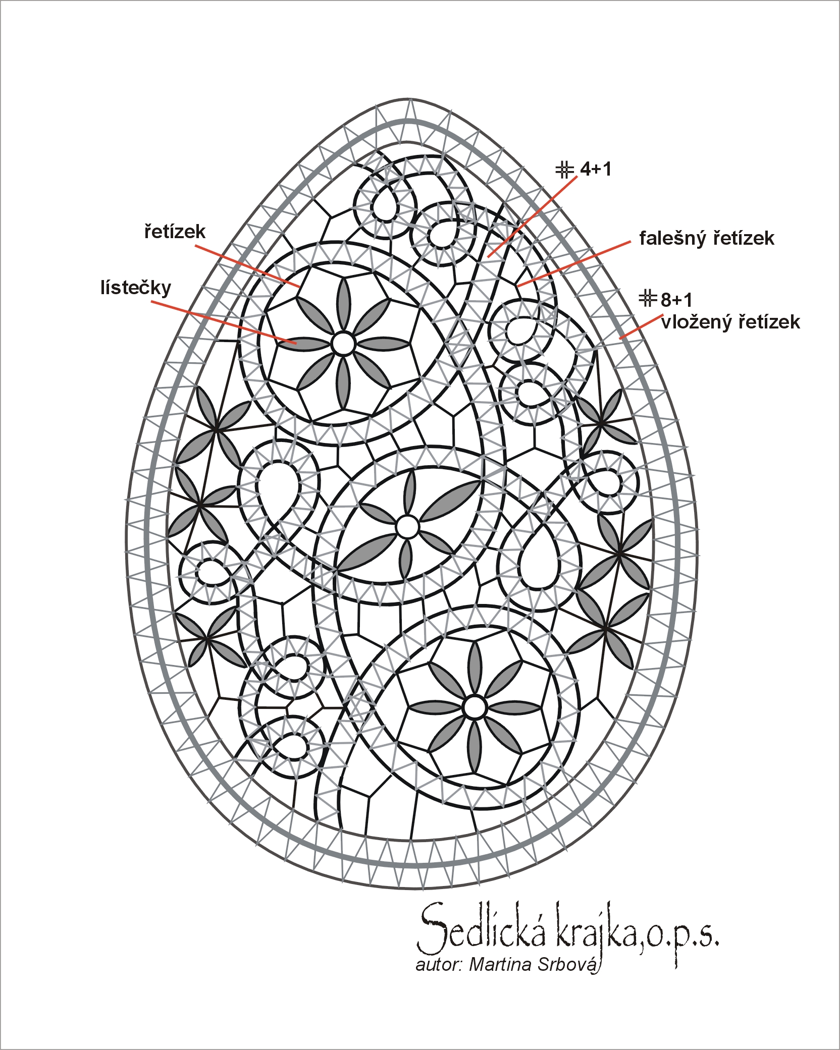 Popis: nejprve si vytvoříme základní tvar vajíčka. Pak v náhodném pořadí paličkujeme spirálky. Válečky/lístečky děláme během tvorby spirálek, případně pokud zvolíme jinou barvu - můžeme je dodělat zvlášť (jako poslední). Spoje mezi jednotlivými spirálovými páskami nám tvoří falešný řetízek.