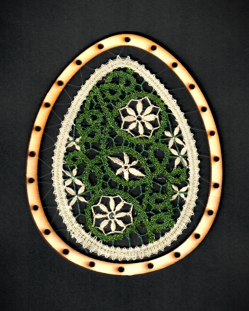 Vajíčko můžeme použít samostatně nebo je vhodné do námi nabízených překližkových výřezů - VAJÍČKO obrys 15,5 cm nebo VEJCE prořezávané a vypalované (najdete na naší prodejně nabo na e-shopu). K přišití krajky do VAJÍČKA (dřevěného výřezu) doporučujeme použít jemné silonové vlákno - NYLON.