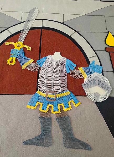 Krajky byly vyrobeny z barevných bavlněných nití a na výrobu hradu a podkladu byla použitá syntetická (polyesterová) plsť, která i do budoucna zajístí stálost a odolnost této velkoprostorové krajky.