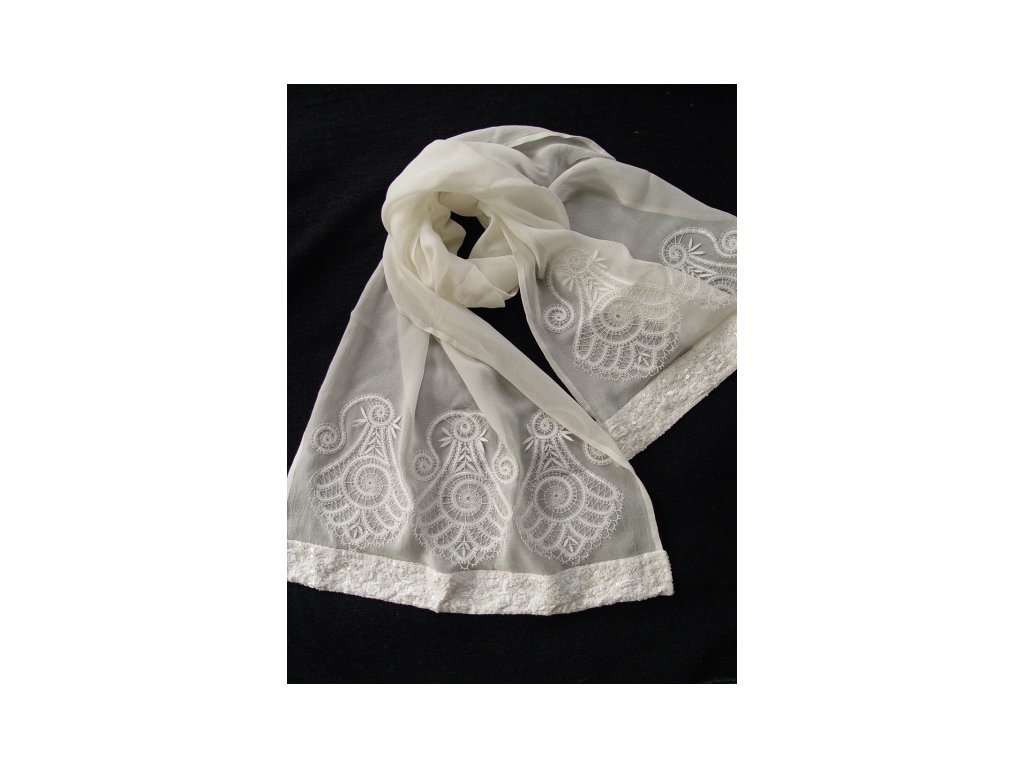 Nepřehlédnutelný oděvní doplněk, vhodný jak na společenské události, tak jako doplněk pro nevěstu. Velikost šálu: 49x175 cm, velikost krajky: 18x43 cm, krajková aplikace na obou koncích šálu, lem je dozdoben korálky a flitry. Barva: bílá