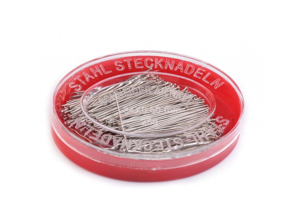 Dlouhé, tenké špendlíky pro náročné krajkářky. Obsah krabičky cca 220 ks (21g), délka 34mm, drát 0,60mm.  Špendlíky nereznou a neohýbají se. V praktické plastové krabičce.