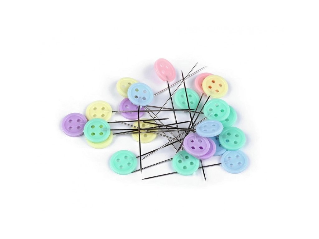 Špendlíky mají  dekorativní (plastovou) hlavičku ve tvaru knoflíku. Mix barev. Délka špendlíku 45 mm. Průměr hlavičky 11 mm. Cena za 1 ks.