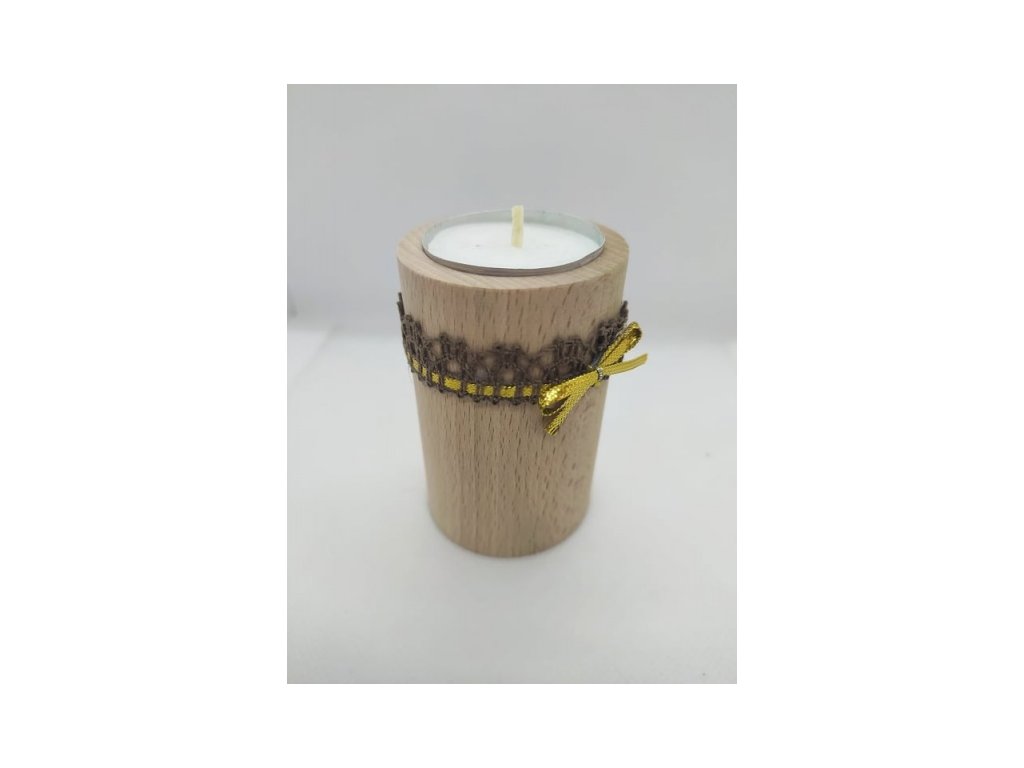 Dřevěný svícen je určený pro čajovou svíčku. Výška 8 cm. Svícen je bez povrchové úpravy. Krajková páska (ruční práce) v hnědé (režné) barvě, dozdobeno zlatou stužkou.