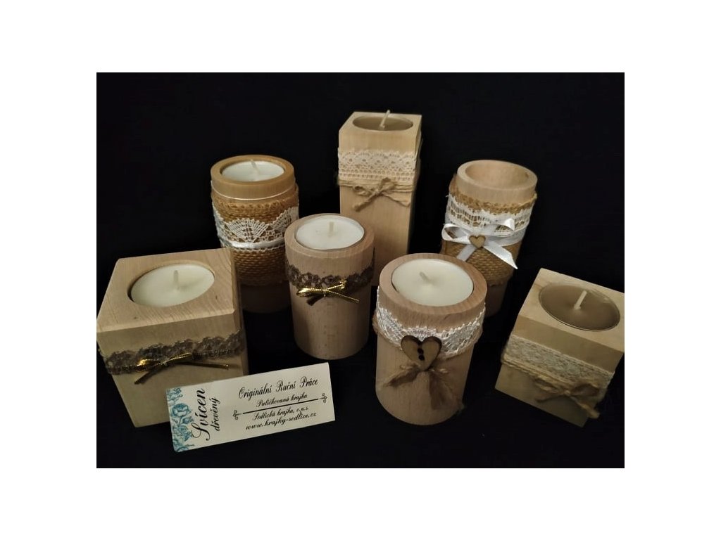 Nabízíme různé druhy dřevěných svícnů, které jsou určené pro čajovou svíčku. V nabídce máme svícny kulaté i hranaté ve velikosti od 5cm do 12cm. Svícen je bez povrchové úpravy. Krajkovou pásku (ruční práce) nabízíme s různými motivy a v různých šířkách. Variabilní je i výběr barev (převážně nabízíme přírodní barvy) a jsou doplněné o stužky, jutu, lněný provázek, korálky nebo dřevěná srdíčka.