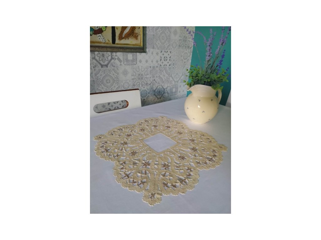 Velikost ubrusu: 130x130 cm. Damaškový bílý ubrus je ze 100% kvalitní bavlny. Velikost krajkové čtvercové aplikace: 40x40 cm. Barevné provedení: přírodní odstíny smetanové a kávové (viz.foto), materiál: 100% bavlna. Krajková aplikace je vsazena do středové části bílého čtvercového ubrusu.