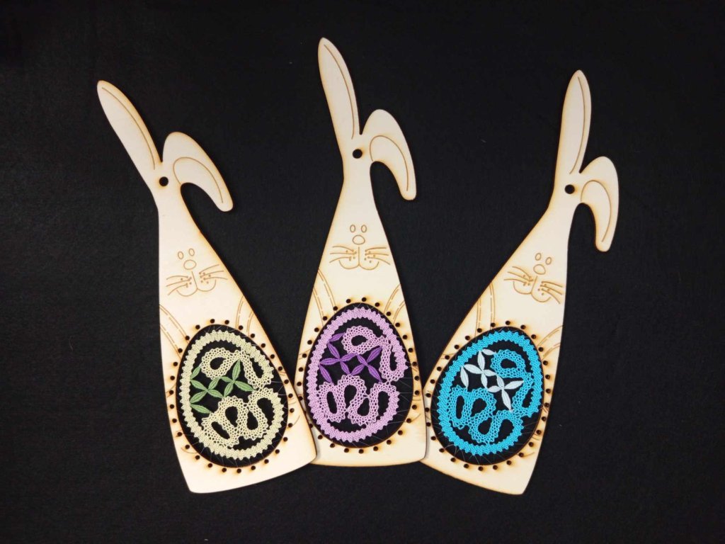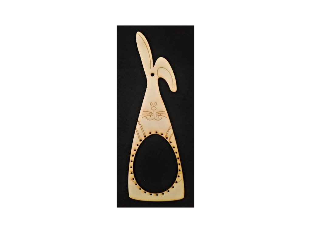 Překližkový výřez určený pro dekorování paličkovanou krajkou. Vhodný pro zavěšení na dveře nebo do okna. Velikost překližkového zajíčka: 28,5 x 8,5 cm, velikost vnitřního vajíčka (určeného pro paličkovanou krajku): 9,5 x 7,5 cm. Výřez je opatřen dírkami pro přichycení krajky. Doporučujeme použít jemný vlasec nebo silonové vlákno - Nylon. Barva: přírodní (viz foto).