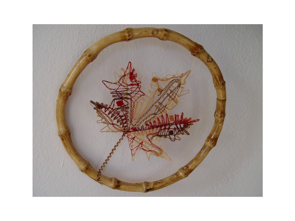 Podzimní bytová dekorace, vhodné jako závěs do okna nebo do prostoru, krajka: barevná (viz.foto), krajka je zavěšená v bambusovém kruhu o velikosti 20 cm.