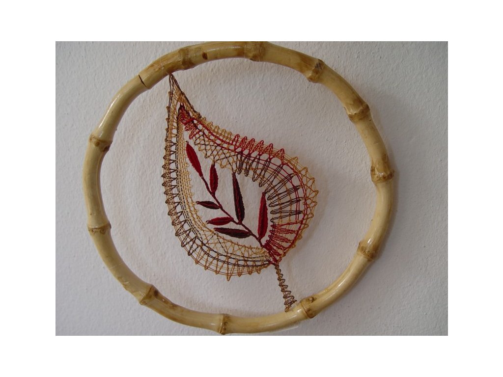 Podzimní bytová dekorace, vhodné jako závěs do okna nebo do prostoru, krajka: barevná (viz.foto), krajka je zavěšená v bambusovém kruhu o velikosti 20 cm.
