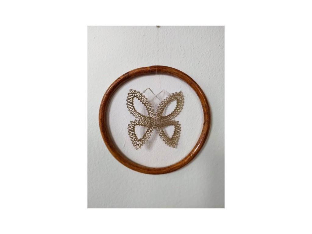 Krajkový motýlek je zavěšený v tmavě hnědém bambusovém kruhu o velikosti 14 cm, vhodný k zavěšení do prostoru/okna - zajímavá dekorace do bytu.