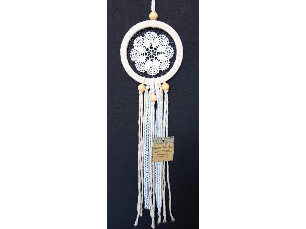 Mini závěs, velikost kruhu: 12 cm, celková velikost: 12 x 40 cm, základ tvoří dřevěný kruh - omotaný bavlněnou přízí Macrame + stuhy a korálky, barva: viz foto