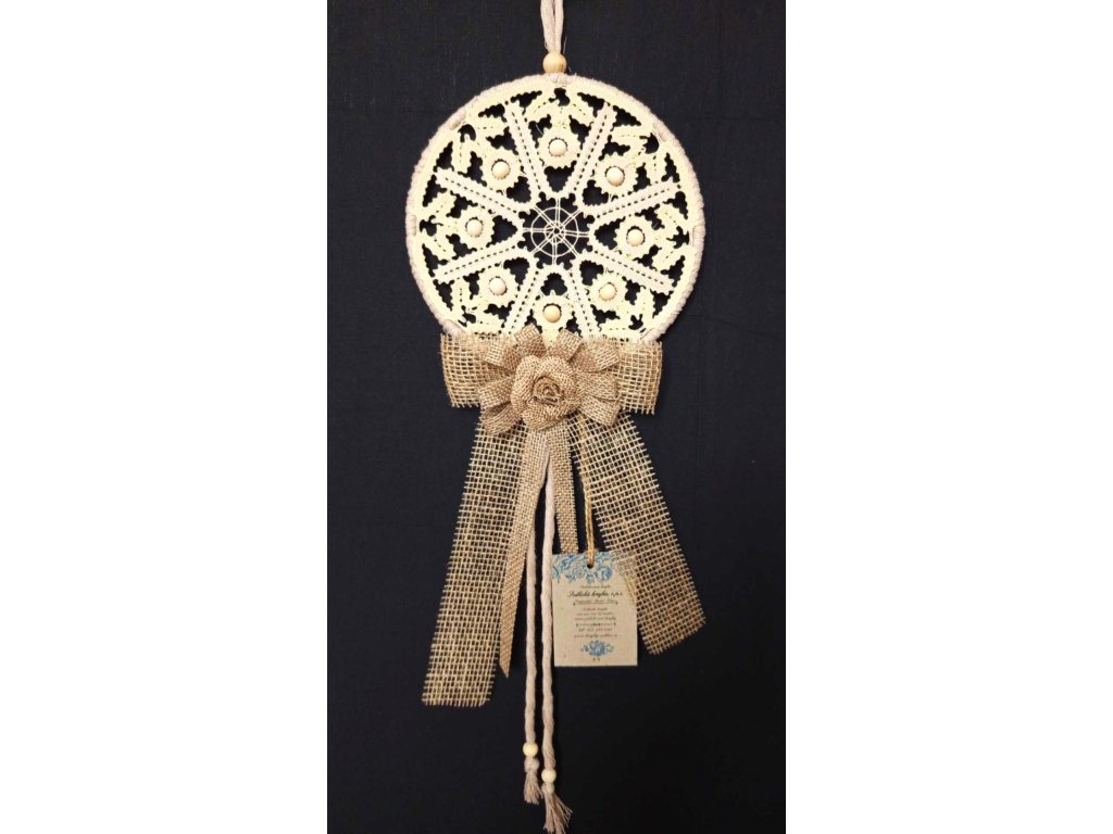 Závěs v přírodních barvách, velikost kruhu: 20 cm, celková velikost: 20 x 40 cm, základ tvoří kovová obruč - omotaná bavlněnou přízí Macrame a paličkovaná krajka (100% bavlna) + mašle z juty, dřevěné korálky, barva: viz foto