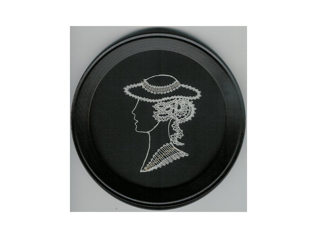 Velikost i s rámem: 16 cm, velikost krajky: 8 x 9 cm, krajka: bílá (viz.foto), podklad: černý. Cena včetně rámečku (dle aktuální nabídky).